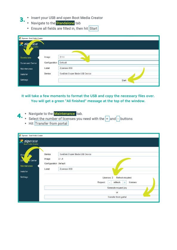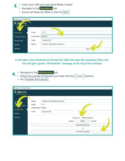 To transfer licenses from the Ziperase Customer Portal website to a Ziperase bootable USB thumb drive, you need an active internet connection. Simply access the Maintenance tab in the Boot Media Creator application.