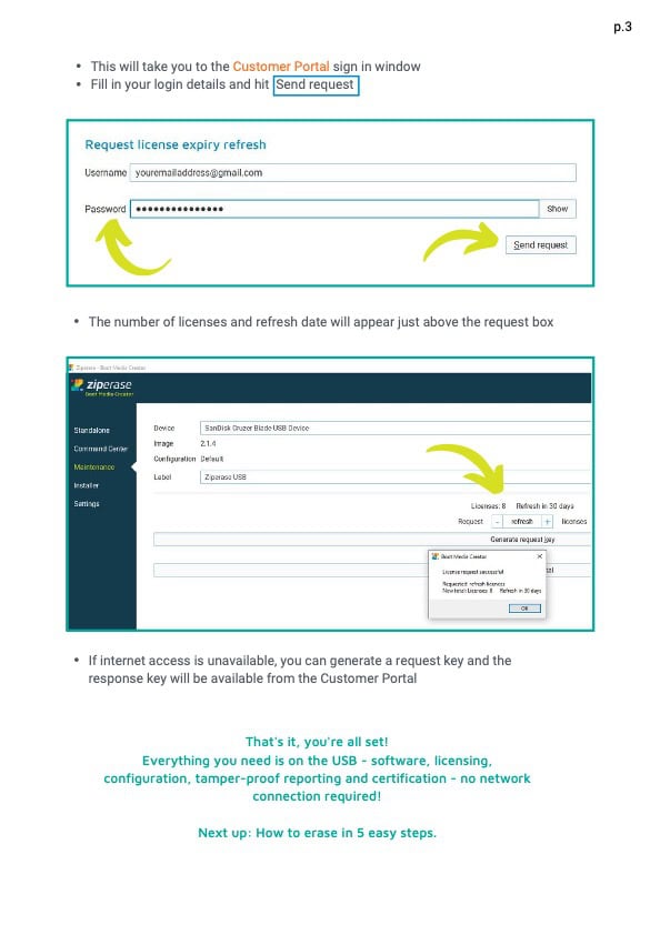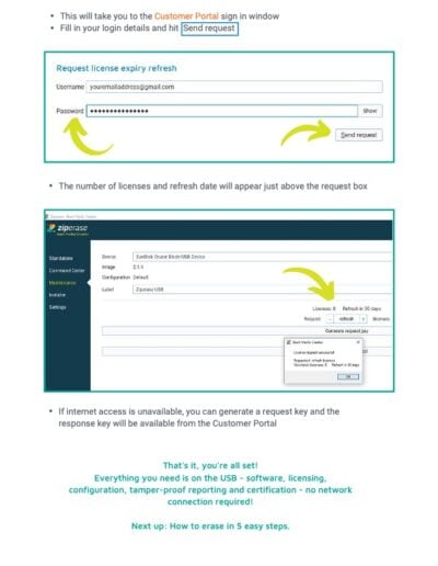 Ziperase licenses do not expire. However, licenses stored on a USB stick need periodic refreshing by checking in with the Ziperase Customer Portal. This refresh occurs automatically when you add more licenses to the USB drive. If you wish to refresh a batch of licenses without adding new ones, you can request zero licenses.