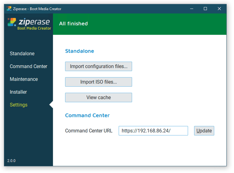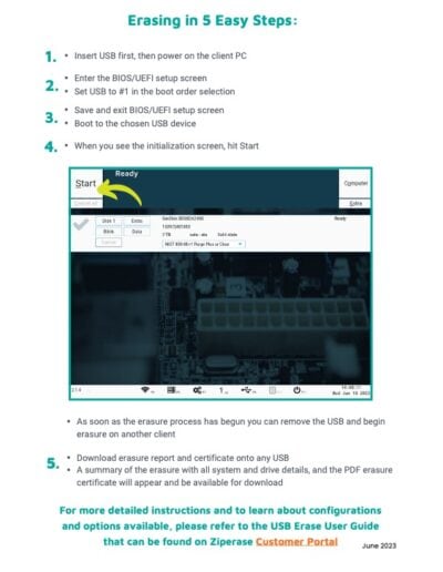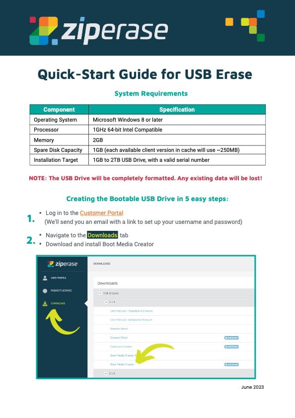 Bootable USB sticks are created using the Ziperase Boot Media Creator (BMC), an app that runs on your Windows PC. It installs and loads the Ziperase software and configuration onto a standard USB drive and stores and manages licenses on the same USB drive.
